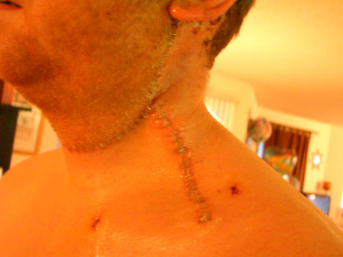 MAN... just looking at that pic I can totally remember how BAD that felt. This is me a few days after surgery #2. The lymph node they took during surgery #1 was positive for the big C, so they went back in a couple weeks later to take all the nodes in the left side of my head. Here I am freshly stapled. |